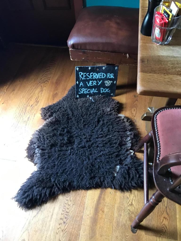 The Anderson, Fortrose, has a prominant position on the High Street in the town and can’t be missed on the drive through. On our recent holiday, which included a stopover in The Black Isle to visit Baby Bomber’s family, we dined in The Whisky Room of The Anderson. The decor has been described in other reviews as ‘tired’ and ‘grubby’ , and it is not to everyone’s taste but I like the dark and slightly eclectic style, heavy on film references. A big plus for us is that it is a dog friendly restaurant and Rousay was welcomed with her own little sheepskin rug and message ‘Reserved for a very special dog’. Rousay, being contrary, decided to sit under a bench beside another table!