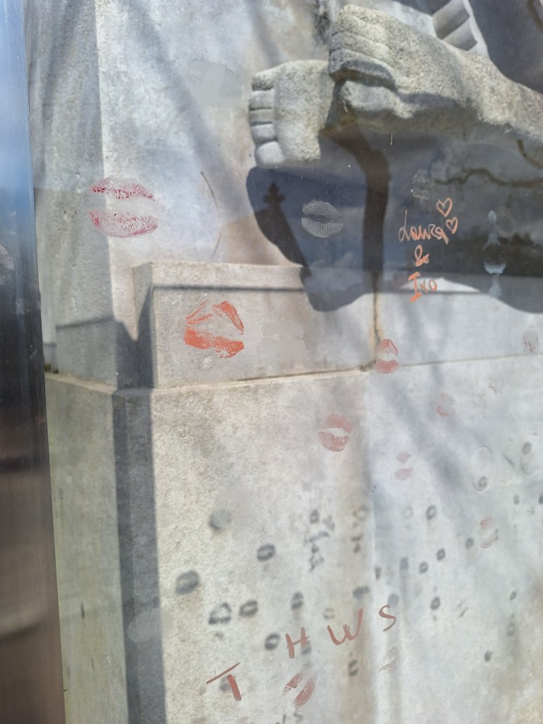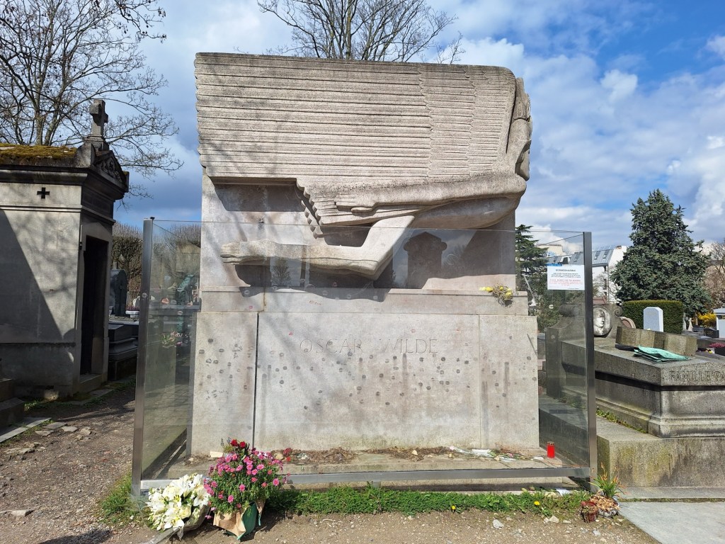 Oscar Wilde’s last resting place is very grand and in an art nouveau style. It has been shrouded in a Perspex shield with a notice which politely asks that visitors not deface the screen. And yet it is covered in lipstick kisses. I was left wondering what Mr Wilde would have thought about such female attention.